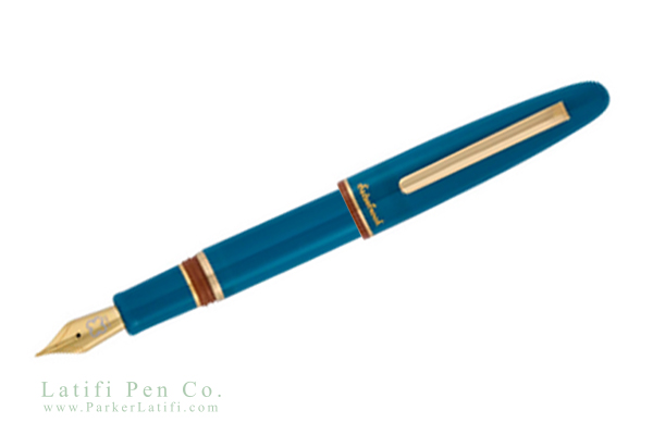 Esterbrook Estie Funky Lake is made of blue acrylic with a brown band on cap and body. It is equipped with a JoWo #6 steel nib and fills ink via standard cartridge/converter.